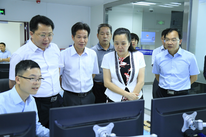黃敏(前右二)一行在廣西ETC數(shù)據(jù)中心機(jī)房調(diào)研,朱堅(jiān)和(左二)、張友坐(左四)、鄧遠(yuǎn)志(右一)陪同。